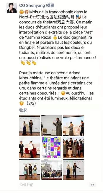 2021年3月13日,由法国驻华大使馆和驻沈阳总领事馆组织的第四届法语戏剧大赛半决赛(东北赛区)在长春师范大学法国文化中心举行,东北大学材料学院材料科学与工程(中外合作)专业2019级本科生张书穹、巩政辛代表东北大学参赛,获得一等奖并入围全国总决赛。