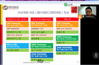 为了让中法学生加深对三个专业方向的了解,更好地做出方向选择并做好未来的发展规划,中法工程学院特意邀请图卢兹大学联盟祝中国办事处主任王小康通过腾讯会议向学生及家长介绍了法国图卢兹三大化学、机械工程和电子电能自动化三个专业的教学和科研基本情况,以及学生最为关心的升学途径和就业前景。