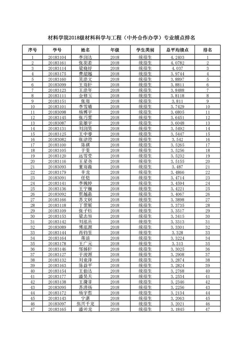 材料学院2018级材料科学与工程(中外合作办学)专业绩点排名