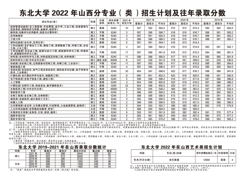 东北大学2022年山西分专业(类)招生计划及往年录取分数
