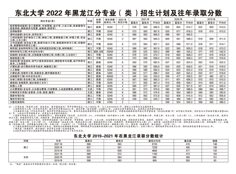 东北大学2022年黑龙江分专业(类)招生计划及往年录取分数