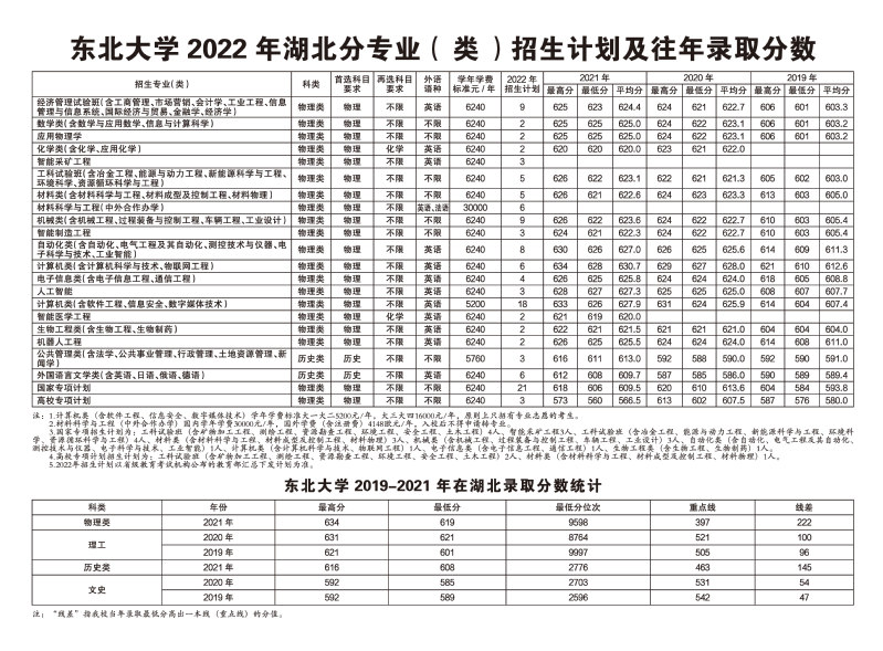 东北大学2022年湖北分专业(类)招生计划及往年录取分数