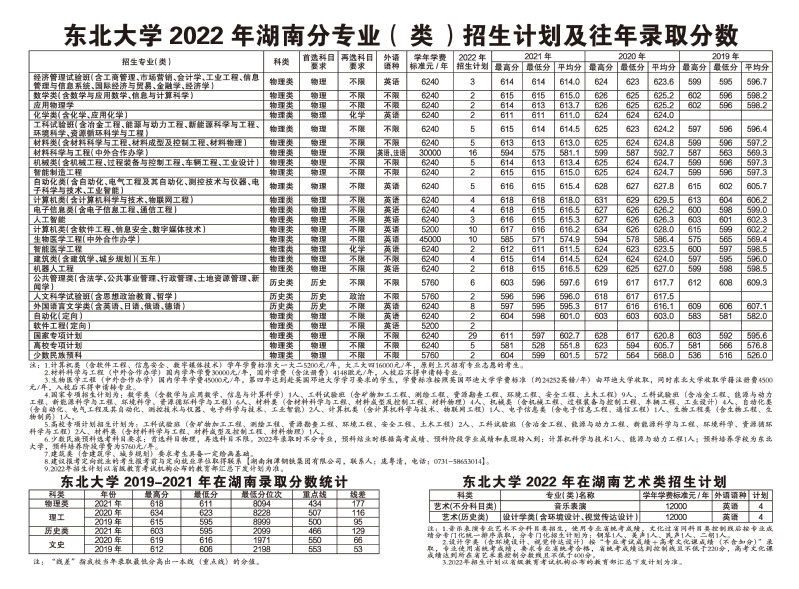 东北大学2022年湖南分专业(类)招生计划及往年录取分数