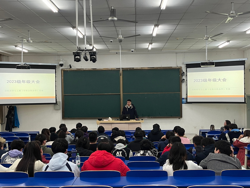 2024年11月8日中午,材料科学与工程学院(中外合作办学)在大成教学馆103召开2023级学生年级大会,材料科学与工程学院团委书记兼中法学生辅导员董磊、教学秘书王欣欣等参加会议。