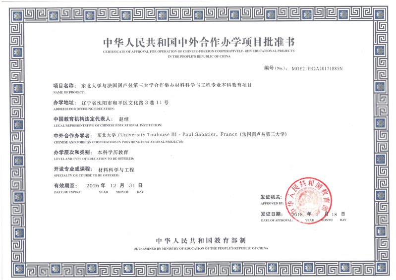 材料科学与工程(中外合作办学)项目是教育部批准的(教外 [2018] 8号函)东北大学与法国图卢兹第三大学合作举办的四年制本科教育项目。该项目整合东北大学材料、机械工程、自动化等重点学科的优质资源,引入法国图卢兹第三大学的高水平教育和研究资源,引进国际化的师资、学生培养方案、教材和教学方法,培养具有广博的理论基础,通晓英语、法语,具有机械工程、电子电能自动化等跨学科背景,在结构材料和功能材料领域具有坚实的理论、实践基础和继续深造潜力,具有跨文化合作能力和国际视野的创新型人才。学生毕业后,可在法国继续进行工程师学位学习或攻读硕士学位。